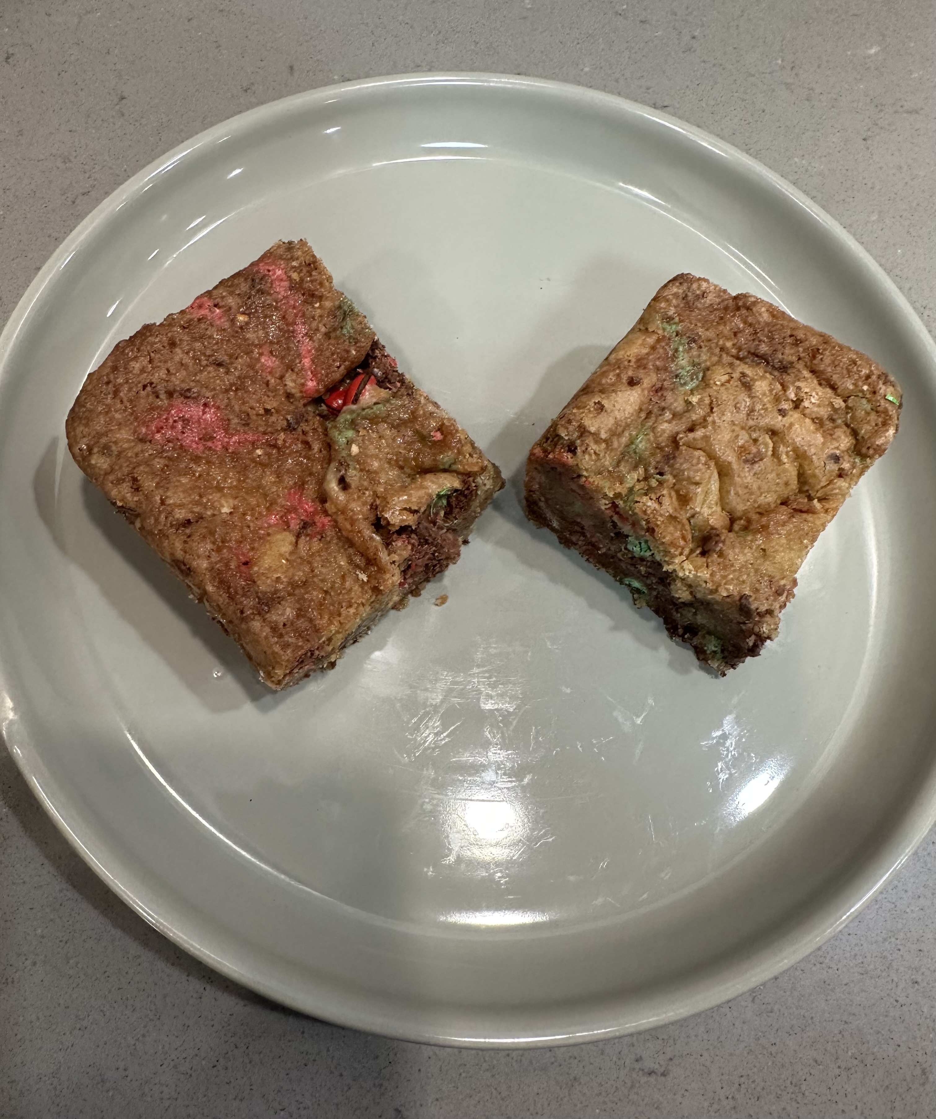 4 Spoon batter into prepared pan, pressing into an even layer. Sprinkle with remaining toffee bits, M&M’s, and chocolate chips over batter.