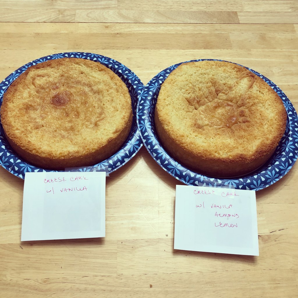 Wedding cake tasting going on around here for our friends Hector and Sarah. They asked for cream cheese cake or coconut cake so we started with this cream cheese cake. The first layer was flavored with vanilla only and the second layer was flavored with vanilla, almond and lemon. The second layer won the taste test of these two and was the 2nd runner up overall. Winner of the cake tasting will be posted tomorrow.